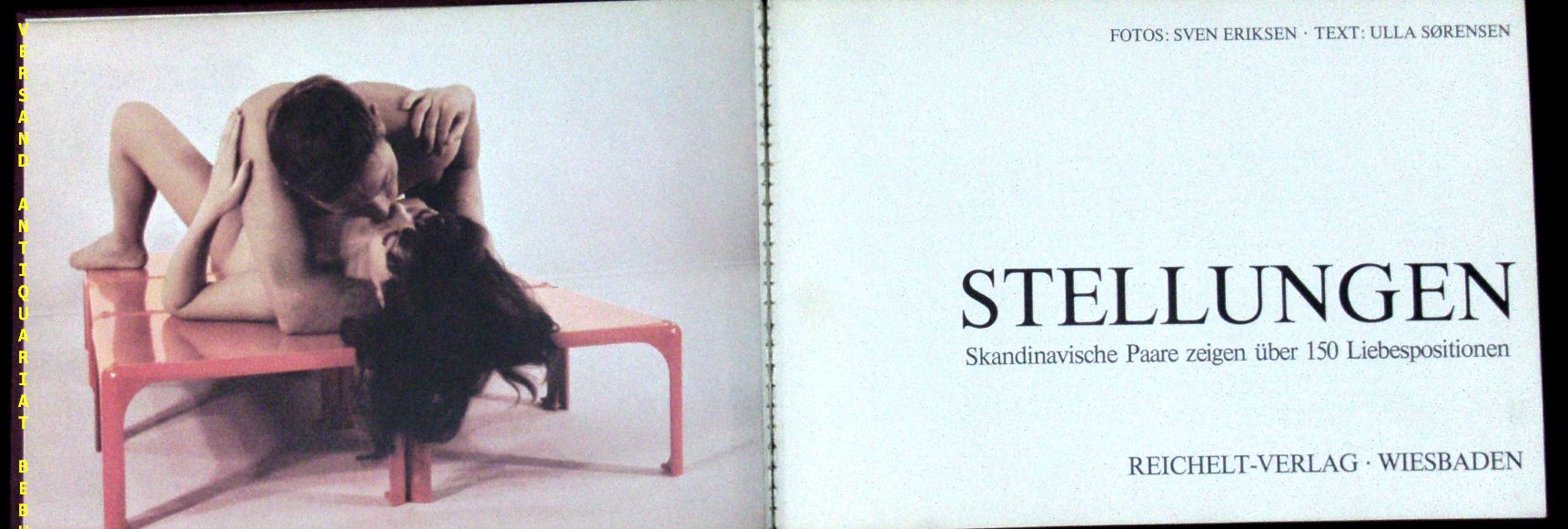 SÖRENSEN, Ulla: Stellungen. Skandinavische Paare zeigen über 150 Liebespositionen. Wiesbaden (Reichelt), 1969. Quer 8°. 194 S. mit zahlr. teils farb. fotografischen Bildern von Sven Eriksen. OPb. gutes Ex. dt. EA.