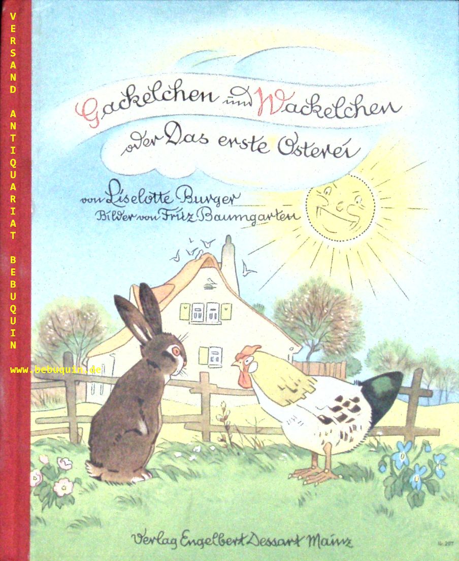 BAUMGARTEN.– BURGER, Liselotte: Gackelchen und Wackelchen oder Das erste Osterei. Mainz (Dessart), 1950. Gr. 8°. 10 Bl. mit 10 farb. Bildtafeln von Fritz Baumgarten. farb. ill. OHLn. feines Ex. EA Blaume 209a.