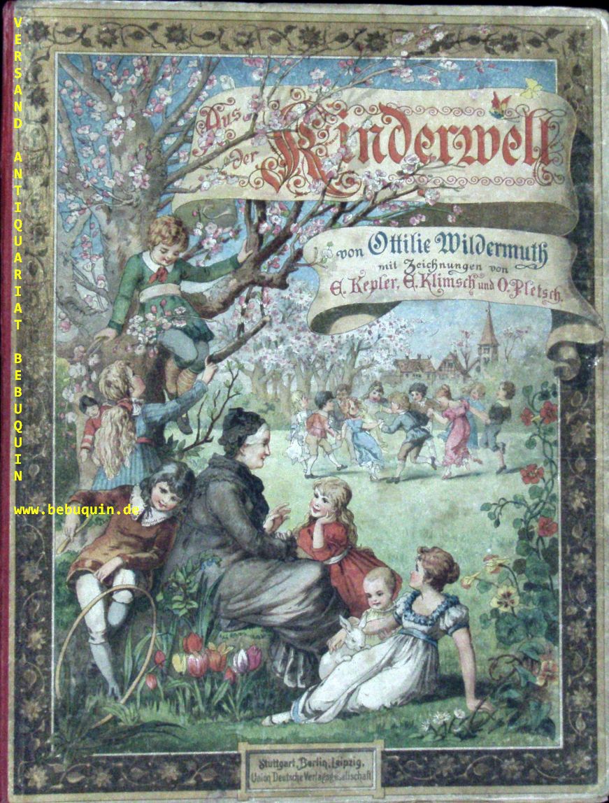 WILDERMUTH, Ottilie: Aus der Kinderwelt. Ein Buch für jüngere Kinder. 34. Aufl. Stuttgart/Berlin/Leipzig, Union Dt. Verlagsges, ca 1928. 4“. 82 S. mit zahlr. Textab. + 10 (anstelle von 6) farb. Bildtafeln von E. Kepler, E. Klimsch und O. Pletsch. farb. ill. OHLn. Einband nur leicht gebräunt, Gelenke mit Klebeband stabilisiert, vereinzelt von Kinderhand koloriert. wohl die letzte bisher nicht beschriebene Auflage. Vgl. Klotz 8276/129.