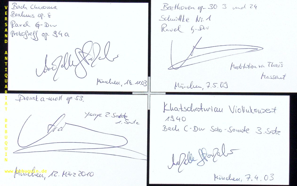 STEINBACHER, Arabella (Violinistin): 4 eigenhändig signierte und datierte Autogrammkarten. München (Philharmonie), 2003 – 2010. 8 x 12,5 cm. 4 Karteikarten. Arabella Steinbacher (* 14. November 1981 in München) ist eine deutsche Violinistin. (Wikipedia)