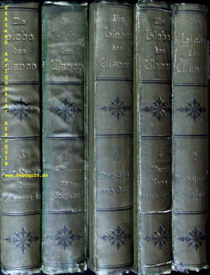 MAY.– (MAY, Karl): Die Liebe des Ulanen. Roman aus der Zeit des Deutsch-Französischen Krieges. Bd. 1 – Die Herren von Königsau, 600 S, 49 Ill. Bd. 2 – Napoleons lezte Liebe, 586 S, 40 Ill. Bd. 3 – Der Kapitän der Kaisergarde, 556 S, 27 Ill Bd. 4 – Der Spion von Ortry, 602 S, 27 Ill Bd. 5 – Durch Kampf zum Sieg, 541 S, 39 Ill. Neue illustrierte Ausgabe. 5 Bände. (komplett). Niedersedlitz-Dresden (Münchmeyer), ca 1908. ca 3000 S. mit über 200 Ill. und dreiseitigem Rotschnitt. ill. OLn. (DB 122). Gelenke fachmännisch nachgeleimt, insgesamt von sehr guter Erhaltung.