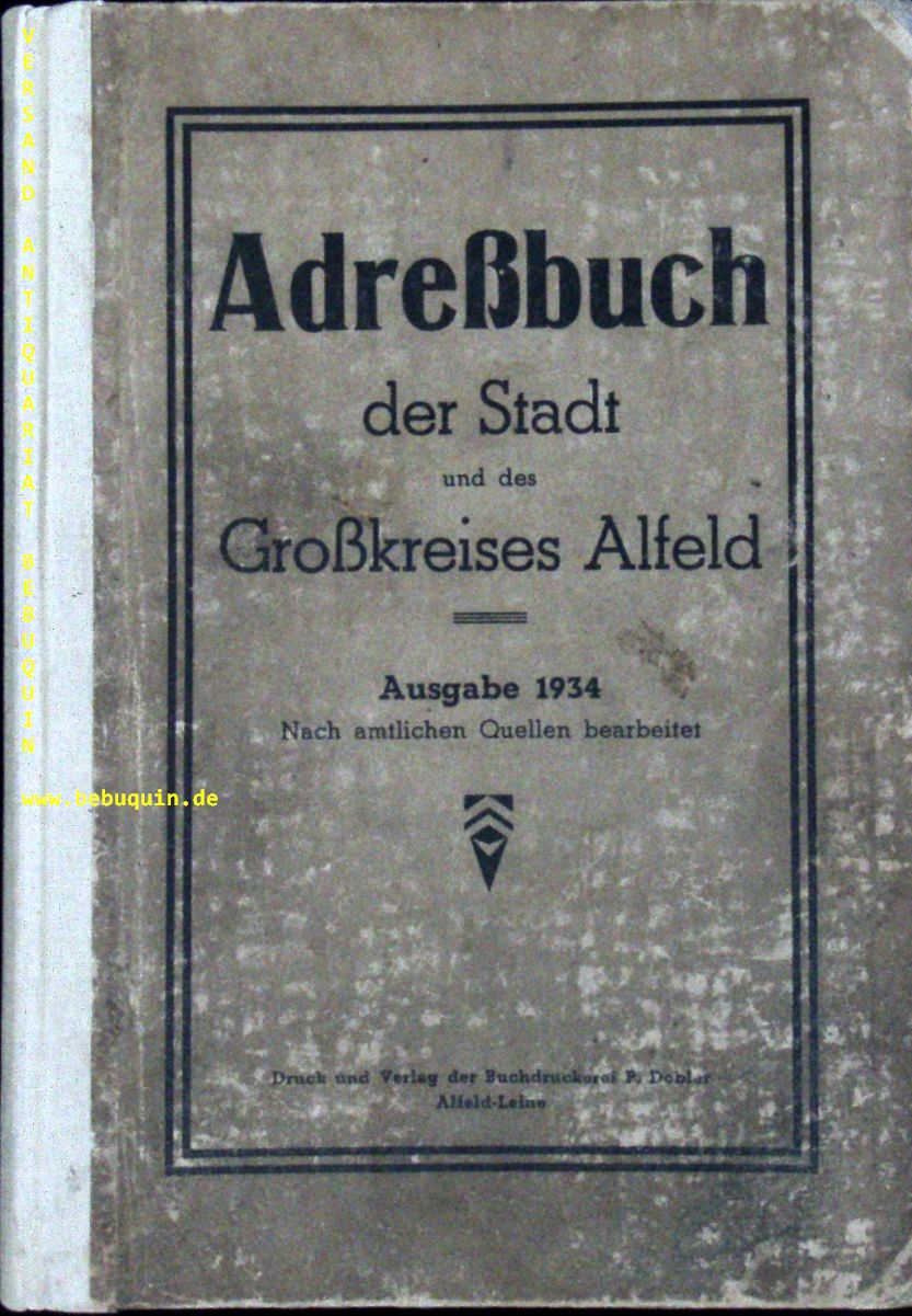 ALFELD.– ADRESSBUCH DER STADT UND dES GROSSKREISDES ALFELD 1934.– Nebst Einwohner-Verzeichnis der benachbarten Ortschaften. Alfeld (Dobler), 1934. Gr. 8°. 328 S. mit zahlr. Abb. und Trennpappen OPb mit neuem Leinenrücken. Einband gebräunt, sonst gutes fachmännisch restauriertes Ex. sehr seltene EA.