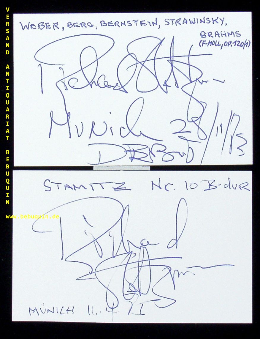 STOLTZMAN, Richard (Klarinettist): 2 eigenhändig signierte und datierte Autogrammkarten. München (Herkulessaal), 1973 + 1975. 8 x 12,5 cm. 2 Karteikarte. Richard Leslie Stoltzman (* 12. Juli 1942 in Omaha, Nebraska) ist ein US-amerikanischer Klarinettist. Stoltzman gilt als einer der bekanntesten heutigen Klarinettisten. (Wikipedia)