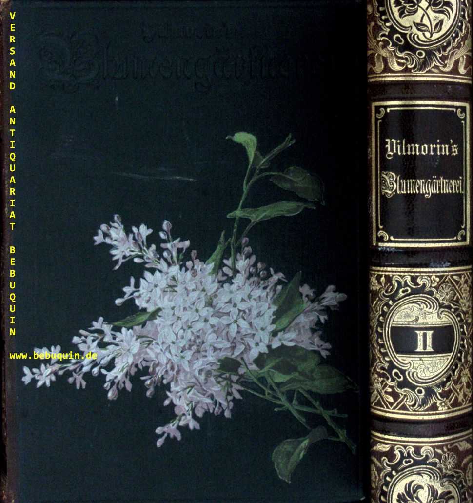 BOTANIK.– VILMORIN, Pierre Louis François Levèque de: Vilmorin’s Blumengärtnerei. Beschreibung, Kultur und Verwendung des gesamten Pflanzenmaterials für deutsche Gärten. 3., neubearb. Aufl. 2 Bände. Berlin (Parey), 1896. VIII, 1264 S. mit 1272 Textabb. und 244 S. + 400 bunten Blumenbildern auf 100 Farbendrucktafel. reich verziertes OHLdr. mit goldgeprägtem Rücken. sehr feines Ex. Die dritte neubearbeite Auflage ist ein Buch mit botanischen Beschreibungen, das von dem deutschen Botaniker und Meteorologen Andreas Voss in den Jahren 1894-1896 in 50 Teilen herausgegeben wurde, mit dem Name von Vilmorins Blumengärtnerei Beschreibung, Kultur und Verwendung des Gesamten Pflanzenmaterials für den Deutschen Garten. Andreas Voss spezialisierte sich auf den Gartenbau und war zusammen mit August E. Siebert (1854-1923) deutscher Redakteur der dritten Auflage des Vilmoriner Leitfadens für die Blumengärtnerei, Vilmorins Blumengärtnerei.