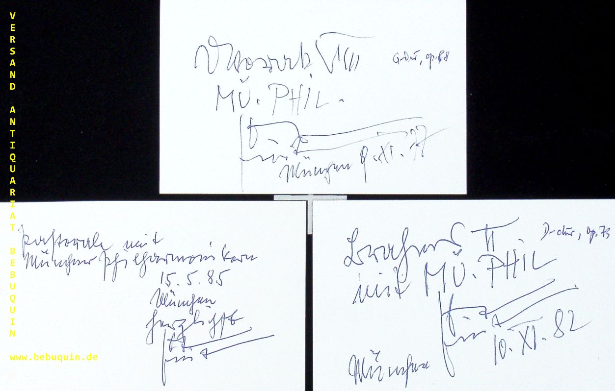 SUITNER, Otmar (Dirigent): 3 eigenhändig signierte und datierte Autogrammkarten mit ausführlichen eigenhändigen Programmbeschreibungen. München (Philharmonie), 1977 – 1985. 8 x 12,5 cm. 3 Karteikarten. Otmar Suitner (* 16. Mai 1922 in Innsbruck, Tirol; † 8. Januar 2010 in Berlin) war ein österreichischer Konzert- und Operndirigent. (Wikipedia)