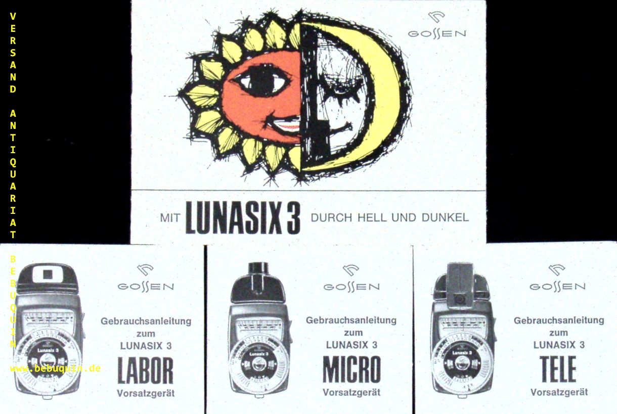 TECHNIK.– LUNASIX 3.– 4 Prospekte der Foto-Firma Gossen. Bedienungsanleitung des belichtungsmessers + Tele + Micro + Labor. Wiesbaden, 1960 ff. unterschiedliche Formate. 4 Hefte mit zahlr. Abb. ill. OKart. gute Erhaltung. 1933 brachte Gossen den weltweit ersten fotoelektrischen Belichtungsmesser „OMBRUX“ heraus. Bis zu dieser wegweisenden Neuerung mussten Fotografen die Belichtungswerte selbst abschätzen. Grundlage dieser Erfindung war die erstmalige Nutzung der lichtelektrischen Eigenschaften des Selens. (Wikipedia)