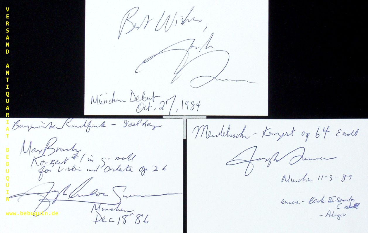 SWENSEN, Joseph (Violinist): 3 eigenhändig signierte und datierte Autogrammkarten. München, 1984 – 18989. 8 x 12,5 cm. 3 Karteikarten. selten. Joseph Swensen is a conductor, violinist, and composer. He is winner of awards, including the Leventritt Foundation Sponsorship Award and the Avery Fisher Career Award. In 2000, Swensen was awarded an honorary doctorate from the University of St Andrews, Scotland. In 2014, he gave a TedX talk with the title “Habitats for Music and the Sound of Math” about music education and the developing brain, at the New York Institute of Technology. (Wikipedia)