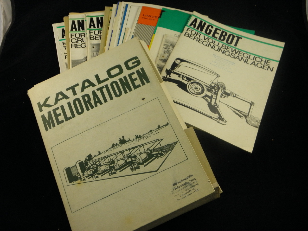 TECHNIK.– KATALOG MELIORATIONEN.– über 20 Prospekte und Kataloge für Beregnungsanlagen. DDR (VEBs), ca 1980. 4°. diverse Prospekte zwischen 2 und 100 S. mit zahlr. Abb. ill. OKart. in ill. OLnMappe. Stempel des VEB Mediarationsbau Leipzig auf Umschlägen, teils gelocht. sehr interessante Sammlung zum Thema mit: Angeboten für vollbewegliche Beregnungsanlagen des Ingenieurbüros Bad Freienwalde, RO Regner aus Bittfeld mit verschiednen Prospekten, Armaturenwerk Herzberg, Ersatzteilliste Rollende Regnerfllügel, Großflüchenregner W68, Betriebsvorschrift Regnomat Versenkhydrant NW 100, Angebot Kleinstaue 1972, Angebot für telbewegliche Beregnungsanlage 1972, Streifenberegnungsmaschine PP 67, Anlage der Grundwasserregulierung, Gülleverregnung in der Pflanzenproduktion, Landwirtschaftliche Verkehrswegenetze, Eingliederung der Gülle aus Tierproduktionsanlagen in die industriemässige Pflöanzenproduktion (!) etc.