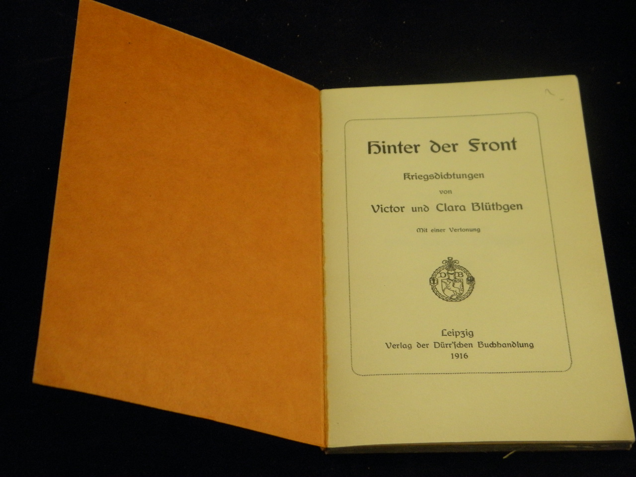 BLÜTHGEN, Victor und Clara: Hinter der Front. Kriegsdichtungen. Vollständige Ausgabe. Leipzig (Dürr), 1916. 104 S. + 4 S. Vertonung. OKart. gutes Ex. seltene EA und wohl letzte Veröfentlichung des Ehepaars. DLL 125.