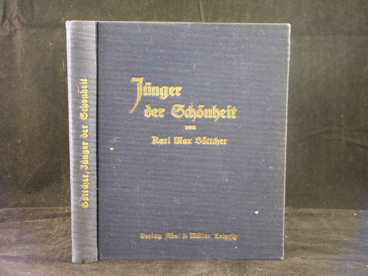 BÖTTCHER, Max Karl: Jünger der Schönheit. Leipzig (Abel u. Müller), (1925). 174 (1) S. OLn. mit Goldprägung. Ex libri auf Innendeckel. seltene EA. Der aus Sachsen stammende Böttcher publizierte vor allem Kriegsromane, Novellen und Militärhumoresken. Nach der Machtergreifung der Nationalsozialisten unterschrieb Böttcher im Oktober 1933 zusammen mit weiteren 87 Schriftstellern das Gelöbnis treuester Gefolgschaft für A.H..1937 publizierte er den Militärschwank Die Kammermaus. Nach dem Ende des Zweiten Weltkriegs lebte er in Chemnitz. (Wikipedia)