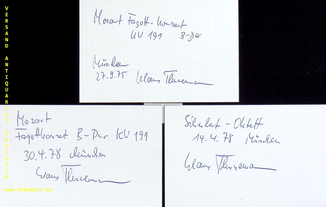 THUNEMANN, Klaus (Fagottist): 3 eigenhändig signierte und datierte Karteikarte. München (Philharmonie), 1975 + 1978. 8 x 12,5 cm. 3 Karteikarte. Klaus Thunemann (* 19. April 1937 in Magdeburg) ist ein deutscher Fagottist. (Wikipedia)