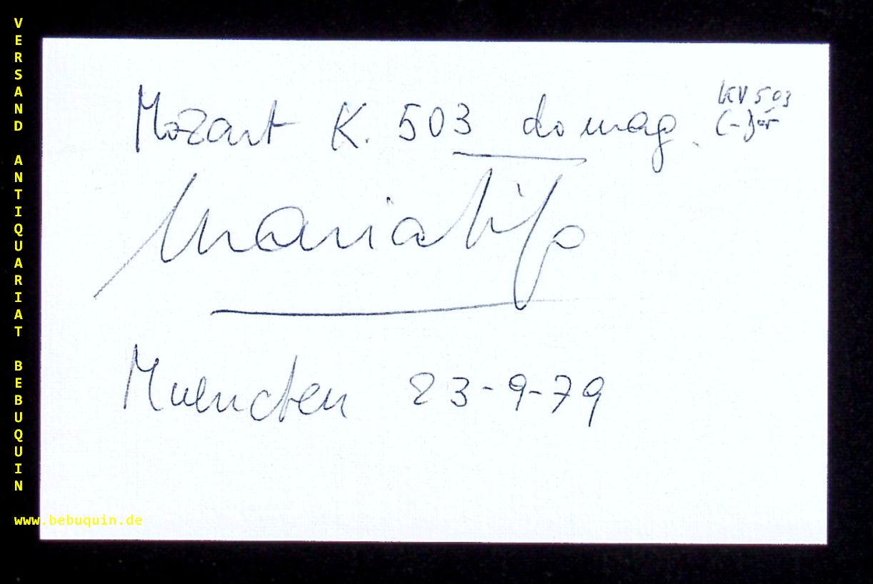 TIPO, Maria (Pianistin): eigenhändig signierte und datierte Autogrammkarte. München, 23.9.1979. 8 x 12,5 cm. Karteikarte. Maria Tipo (* 23. Dezember 1931 in Neapel) ist eine italienische Pianistin. (Wikipedia)