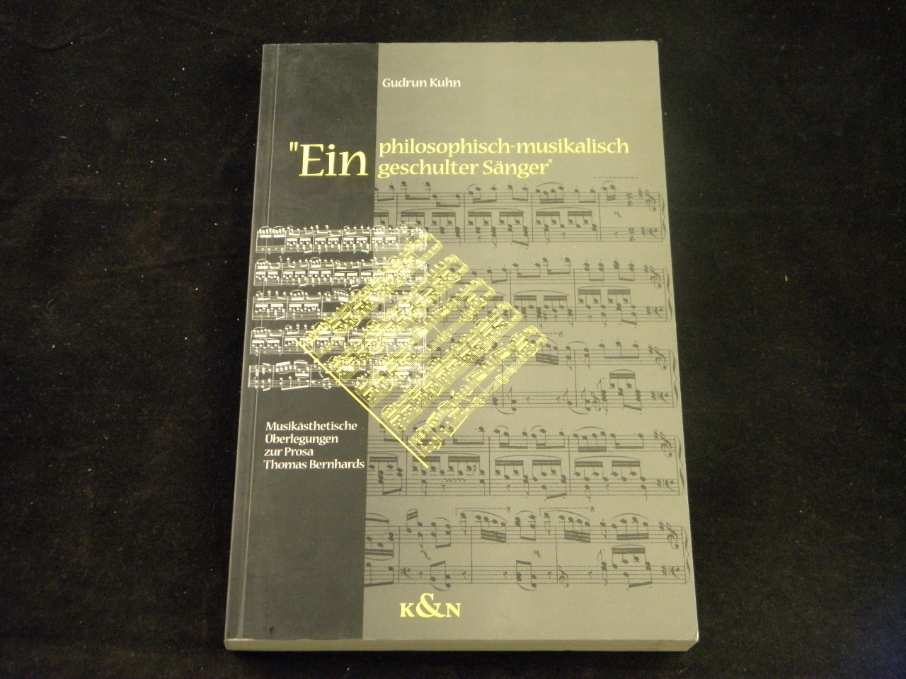 BERNHARD.– KUHN, Gudrun: „Ein philosophisch-musikalisch geschulter Sänger“. Musikästhetische Überlegungen zur Prosa Thomas Bernhards. Würzburg (Königshausen und Neumann), 1996. Gr. 8°. 265 S. mit Noten. ill. OKart. wie neu = Epistemata : Reihe Literaturwissenschaft, Bd. 183. EA mit der datierten eigenhändigen Signatur der Autorin auf Vorsatz.