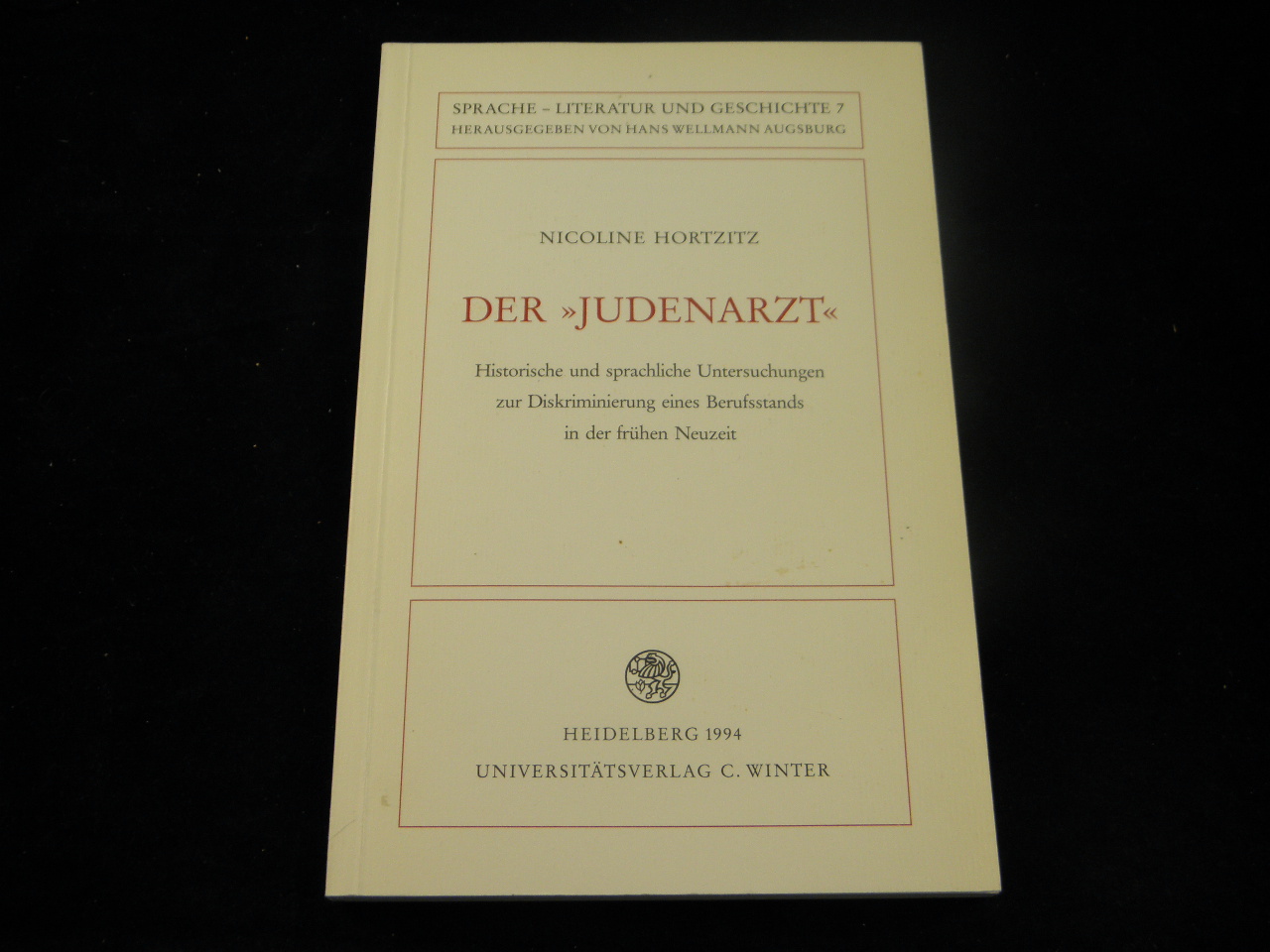 GERMANISTIK.– HORTZITZ, Nicoline: Der „Judenarzt“. Historische und sprachliche Untersuchungen zur Diskriminierung eines Berufsstands in der frühen Neuzeit. Heidelberg (Winter), 1994. X, 162 S. OKart. = Sprache – Literatur und Geschichte, Bd. 7. EA.