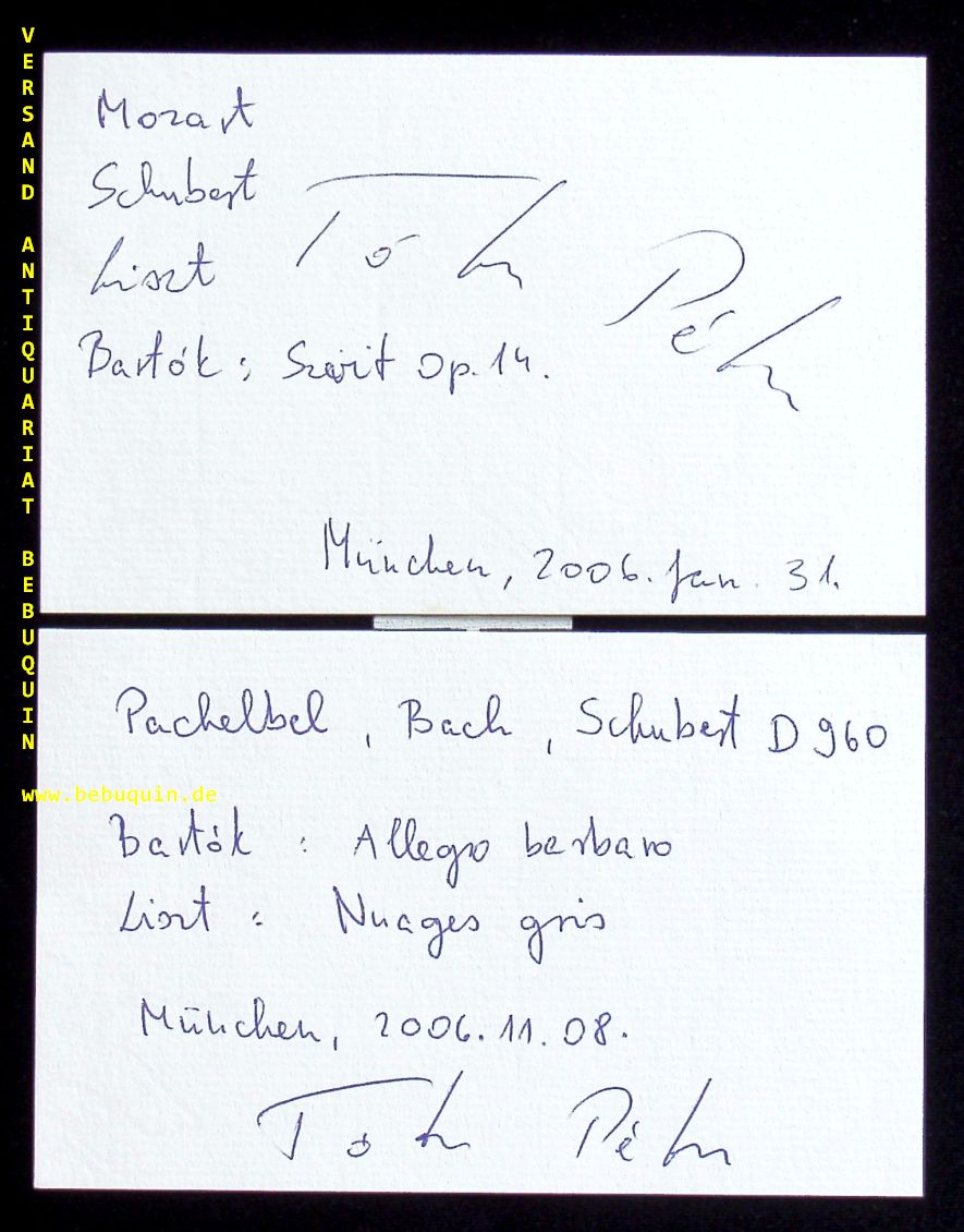 TOTH, Peter (Pianist): 2 eigenhändig signierte und datierte Autogrammkarten. München (Philharmonie), 2006 + 2008. 8 x 12,5 cm. 2 Karteikarten. Péter Tóth (born 1983 in Hungary) is a pianist and winner of the International Piano Competitions in Wittenberg (1997), Bovino (1998), International Franz Liszt Piano Competition in Weimar (2000) and in Budapest (2001). In 1998 he received the Liszt Academy’s “Sari Biro Memorial Award” as the best young pianist of the year. (Wikipedia)