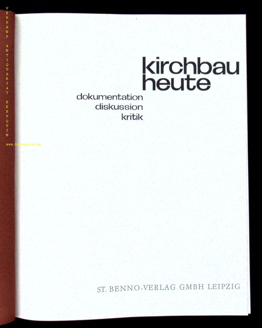 ARCHITEKTUR.– KIEL, Elfriede: (Hrsg.) Kirchenbau heute. Dokumentation, Diskussion, Kritik. Leipzig (Benno), 1969. Gr. 8°. 360 S. mit zahlr. Bildtafeln, Karten, Skizzen etc. OPrgt mit goldgeprägtem Rücken. sehr feines Ex. EA. Mit einer eigenhändigen signierten Briefkarte des Typografen Clemens Augusat Steffen an die Herausgeberin inliegend: ″Als kleines Angebinde überreichen wir Ihne Ihre neueste Schöpfung, an deren Gestaltung wir gemeinsam gearbeitet haben. . . Der kostbare Einband möge Ihnen den Wert dieser Arbeit stets vor Augen führen.″