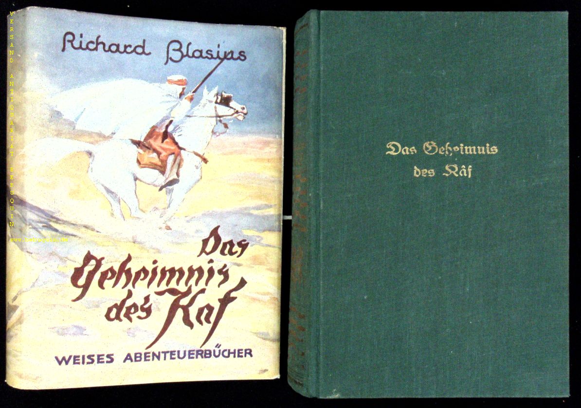 BLASIUS, Richard: Das Geheimnis des Kâf. Abenteuer-Roman. Stuttgart (Weise), (1929). 381 (2) S. OLn. mit OUmschl. feines Ex. = Dolf Karstens Reiseabenteuer. EA Klotz 521/4.