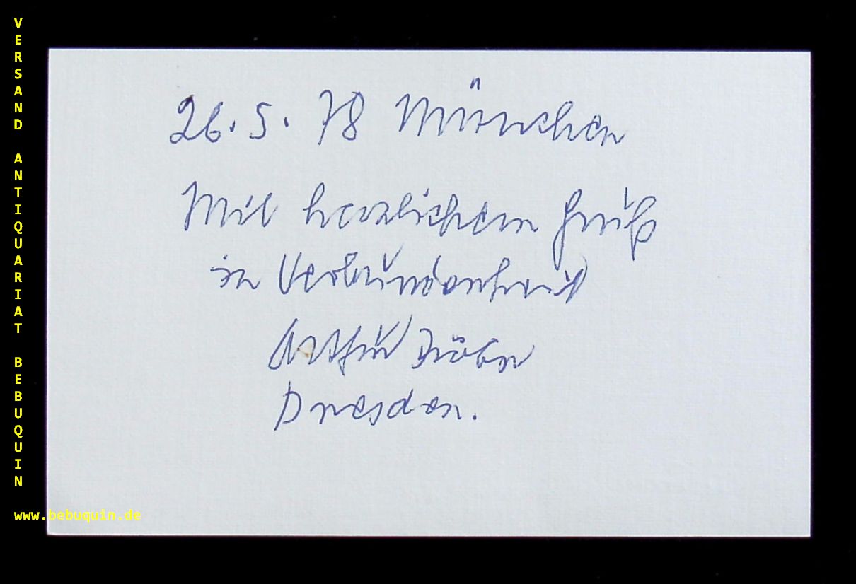 TRÖBER, Arthur (Violinist): eigenhändig signierte und datierte Autogrammkarte: Mit herzlichen Grüßen in Verbundenheit. München (Philharmonie), 26.5.1978. 8 x 12,5 cm. Karteikarte. Arthur Tröber (1898-1981), Geiger und vielfältiger Organisator mit hohen Verdiensten um die Dresdener Staatskapelle (er übernahm 1939 von Theo. Bauer die Leitung).