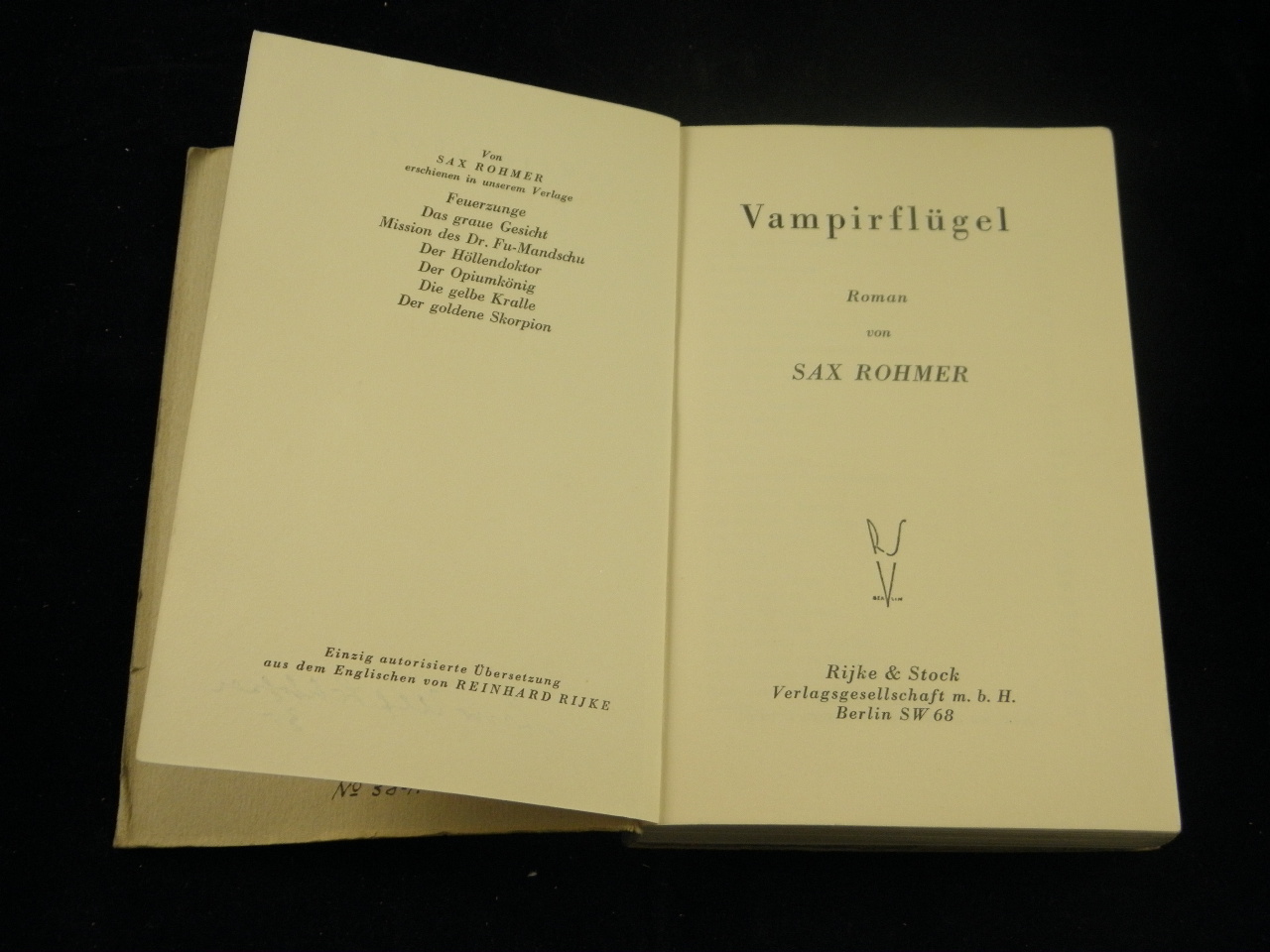 ROHMER, Sax: Vampirflügel. D.v. Reinhard Rijke. Berlin (Rijke & Stock), (1930). 242 (5) S. schlichter OKart. NaV. EA. nicht bei Bloch.