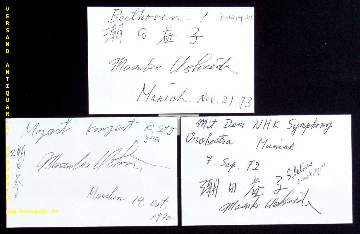 USHIODA, Masuko (Violinistin): 3 eigenhändig signierte und datierte Autogrammkarten. München (Herkulessaal), 1970 – 1973. 8 x 12,5 cm. 3 Karteikarte. Masuko Ushioda (Shenyang, April 4, 1942 – Boston, May 28, 2013) was a Japanese violinist who had an international career as soloist and teacher. (Wikipedia)