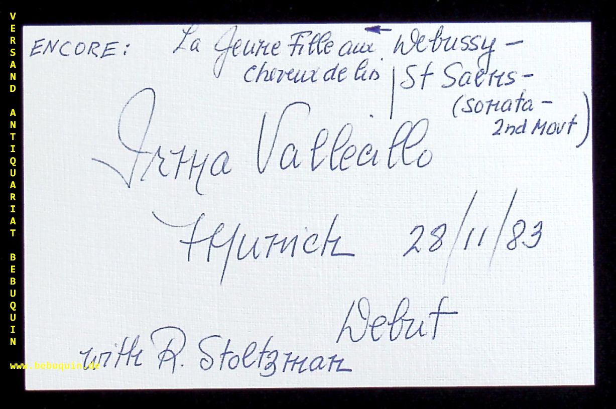 VALLECILLO, Irma (Pianistin): eigenhändig signierte und datierte Autogrammkarte: Debut. München (Herkulessaal), 28.11.1983. 8 x 12,5 cm. Karteikarte. Osmo Antero Vänskä (* 28. Februar 1953 in Sääminki, Finnland) ist ein finnischer Dirigent. (Wikipedia)