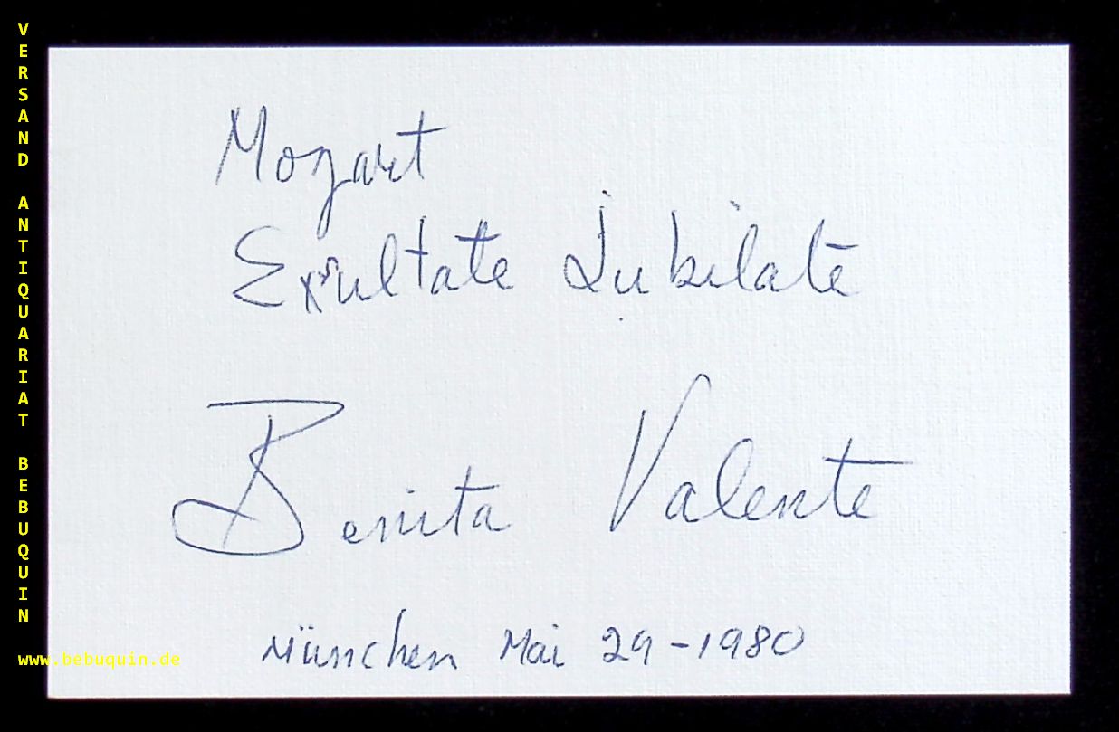 VALENTE, Benita (Sopran): eigenhändig signierte und datierte Autogrammkarte. München (Herkulessaal), 29.5.1980. 8 x 12,5 cm. Karteikarte. Benita Valente wurde geboren: 19. Oktober 1934, Delano, Kalifornien, Vereinigte Staaten. Sie ist eine angesehene amerikanische Sopranistin, deren lange Karriere die Opernbühne sowie die Aufführung von Liedern, Kammermusik und Oratorium umfasste. Sie wird besonders für ihre Interpretationen von Mozart und Händel gelobt, aber sie hat sich auch in bestimmten Verdi-Rollen hervorgetan. (Wikipedia)