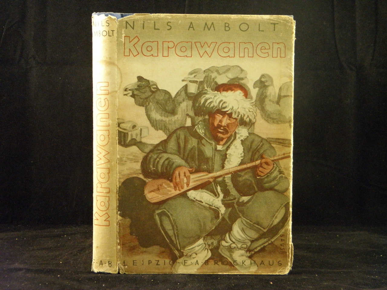 ASIEN.– AMBOLT, Nils: Karawanen. Im Auftrag Sven Hedins durch Innerasien. Leipzig (Brockhaus), 1937. Gr. 8°. 191 S. + 100 z.T. farb. Bildern auf Tafeln sowie 1 Karte. ill. OLn. mit OUmschl. teils stockfleckig, Umschlag etwas lädiert. EA.
