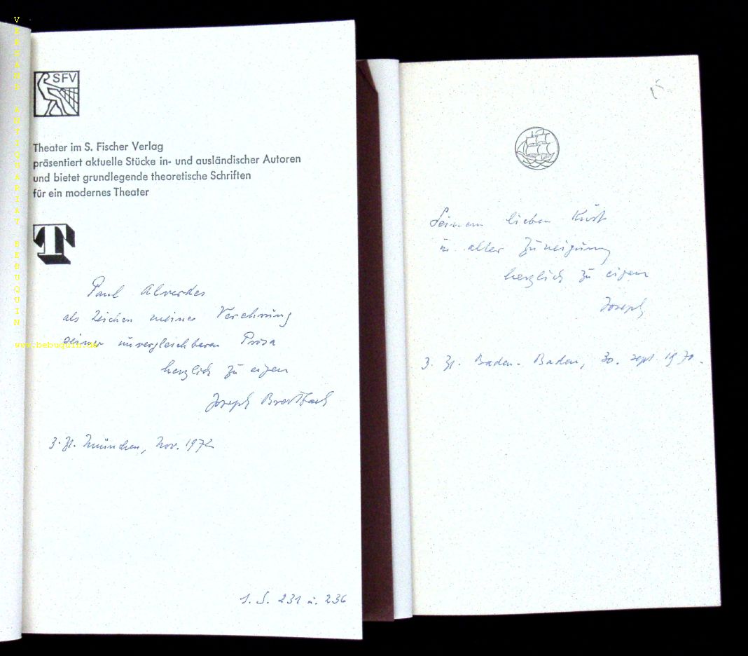 BREITBACH, Joseph: 2 signierte Ausgaben. 1. Genosse Veygond. 2. Die Jubilarin etc. Frankfurt (Insel), 1970 ff. 100 bzw. 250 S. OKart. 1. Auflagen dieser Ausgaben mit besonderen eigenhändigen Widmungen an berühmte Schrifstellerkollegen wie Paul Alverdes + Kurt (?).