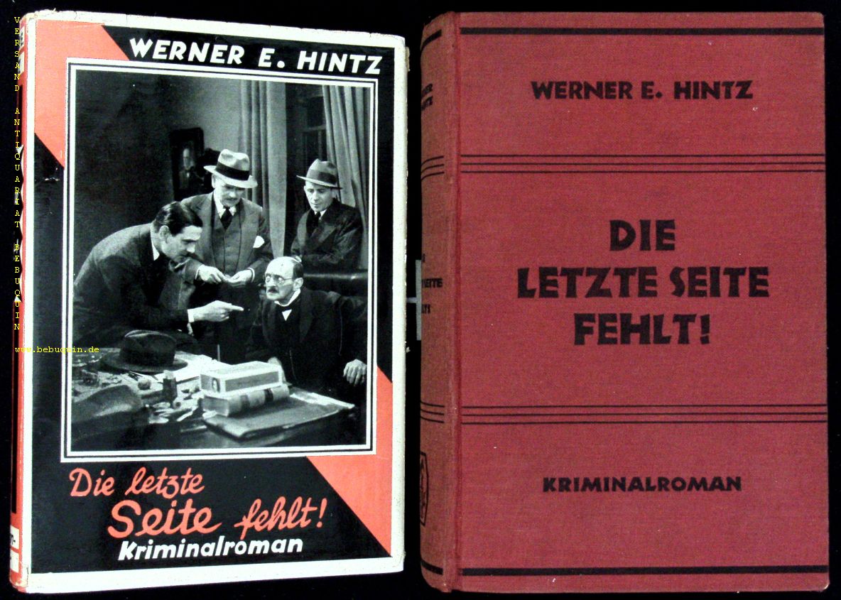 HINTZ, Werner E.: Die letzte Seite fehlt. Kriminalroman. Berlin (Otto Uhlmann), 1935. 271 S. OLn. mit OUmschl. gutes Ex. = Uhlmann – Bücher. EA des seltenen Krimis. Schädel 3473.