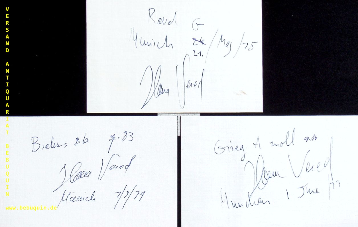 VERED, Ilana (Pianistin): 3 eigenhändig signierte und datierte Autogrammkarten. München (Herkulessaal), 1975 – 1979. 8 x 12,5 cm. 3 Karteikarten. Ilana Vered (born December 6, 1943 in Tel Aviv, Israel) is a concert pianist and professor of piano. (Wikipedia)