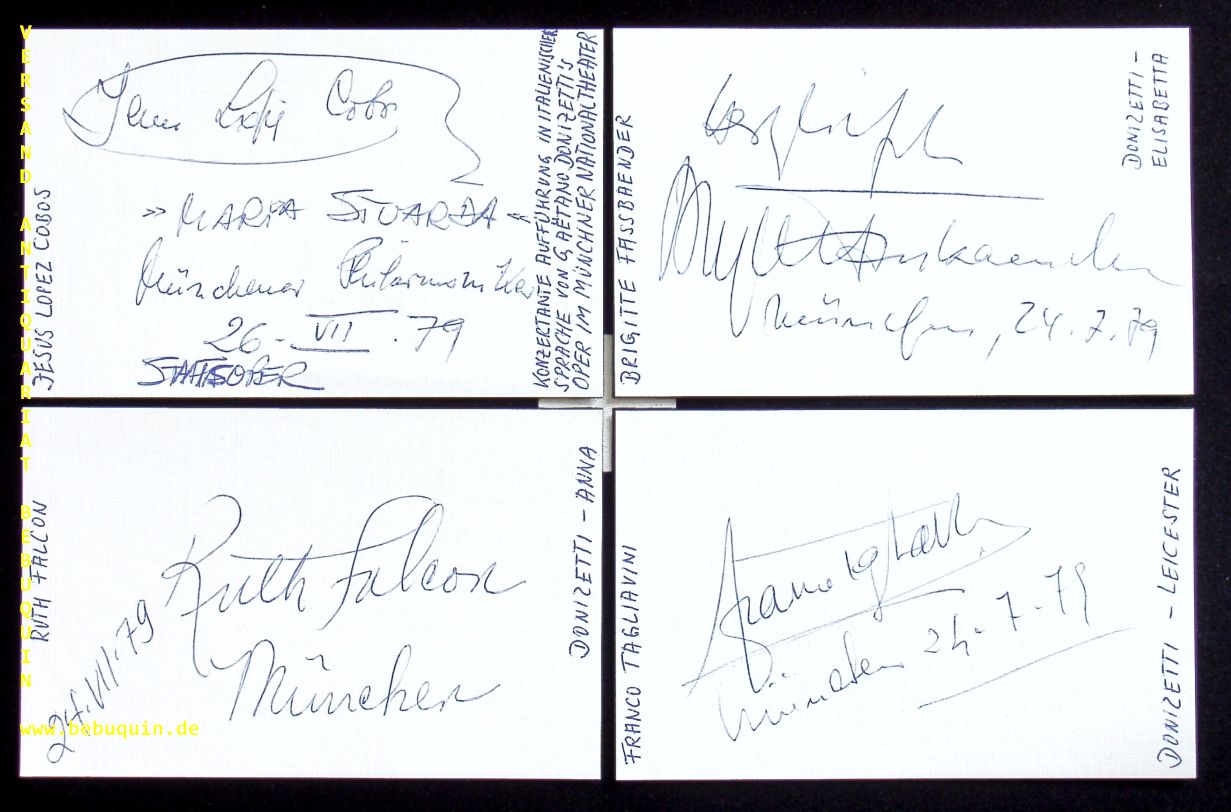 COBOS, Jesus Lopez (Dirigent) + CABALLE, Montserrat + FASSBAENDER, Brigitte + TAGLIAVINI, Franco + LLOYD, Robert + BRINKMANN, Bodo + FALCON, Ruth: 7 eigenhändig signierte und datierte Autogrammkarten. Maria Stuart von Donizetti. München, 26.7.1979. 8 x 12,5 cm. 7 Karteikarten in Programmblatt. Jesús López Cobos (* 25. Februar 1940 in Toro, Provinz Zamora; † 2. März 2018 in Berlin, Deutschland) war ein spanischer Dirigent. (Wikepedia)