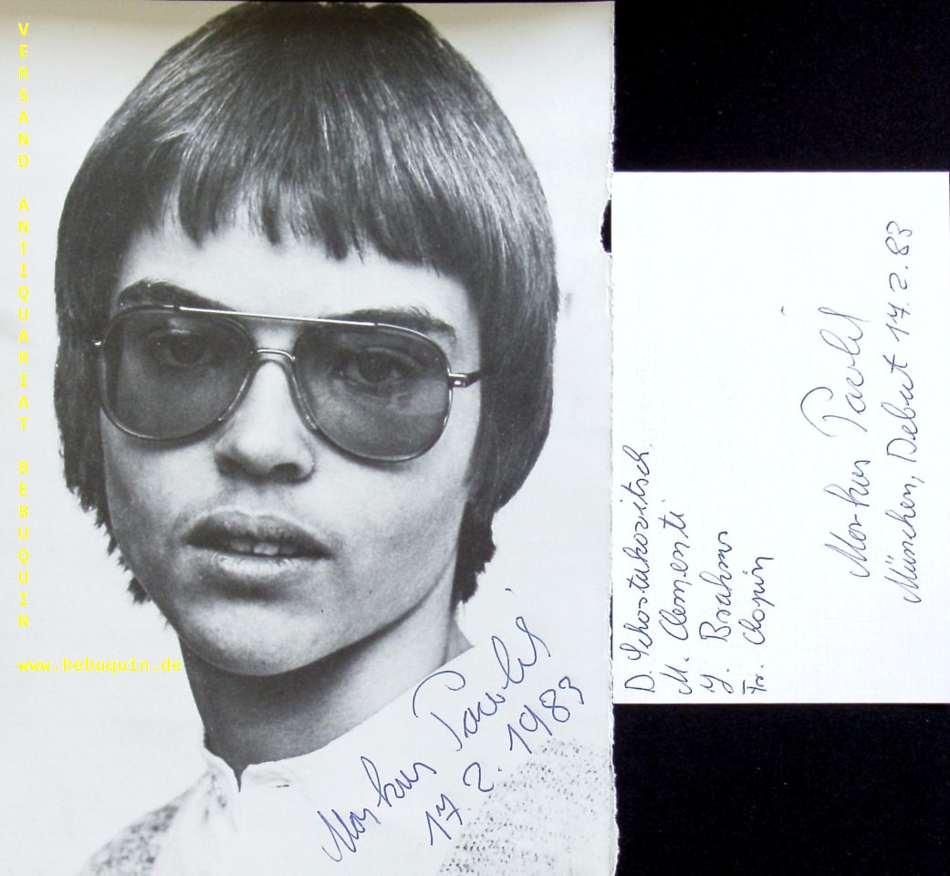 PAWKIK, Maerkus (Pianist): eigenhändig signierte und datierte Portraitseite + eigenhändig signierte und datierte Autogrammkarte. München Debut. München (Philharmonie), 17.2.1983. 20 x 21 + 8 x 12,5 cm. 2 Bl. Markus Pawlik lässt sich am besten als einer der heutzutage selten gewordenen Pianisten beschreiben, die Sensibilität und Ausdruckskraft mit einer überragenden virtuosen Technik verbinden. Er wurde 1966 in Bremen geboren, und seine Begabung wurde frühzeitig erkannt. Mit sieben Jahren begann er öffentlich aufzutreten, und gewann in der Folge dreimal den Bundeswettbewerb „Jugend musiziert“. 1982 wurde er als Vertreter Deutschlands zum ersten Fernsehwettbewerb der Europäischen Rundfunkunion (Eurovision Young Musicians) entsandt. Er gewann den ersten Preis, was ihm große Beachtung einbrachte und den Beginn seiner internationalen Karriere darstellte.