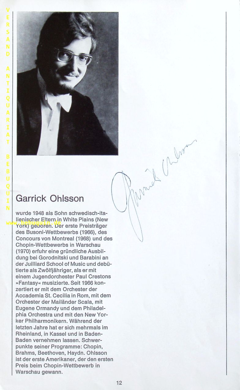 OHLSSON, Garrick (Pianist): eigenhändig signierte Portraitseite. München, 14.5.1973. 26 x 16 cm. 1 Bl. Garrick Ohlsson (* 3. April 1948 in Bronxville (New York)) ist ein US-amerikanischer Pianist. Ohlsson ist der bisher einzige US-Amerikaner, der den Internationalen Chopin-Wettbewerb in Warschau gewonnen hat.