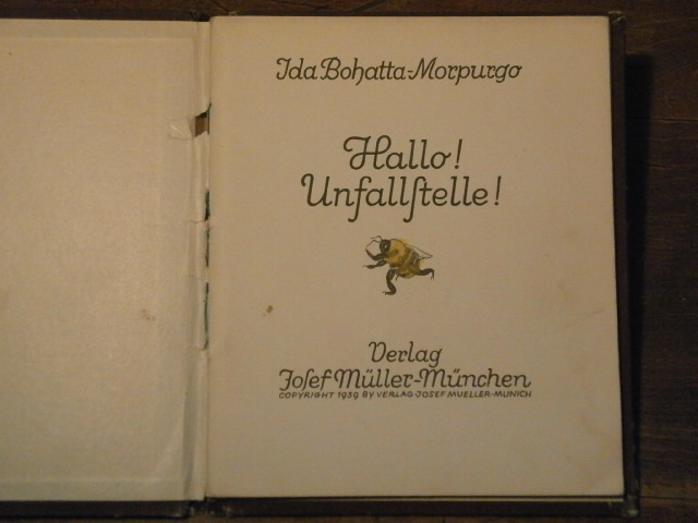 BOHATTA-MORPURGO, Ida: Hallo! Unfallstelle! München (Josef Müller), 1939. 12°. 13 Bl. mit 12 farb. Bildtafeln. farb. ill. OPb. Rücken beschädigt, leicht ausgebunden. EA.