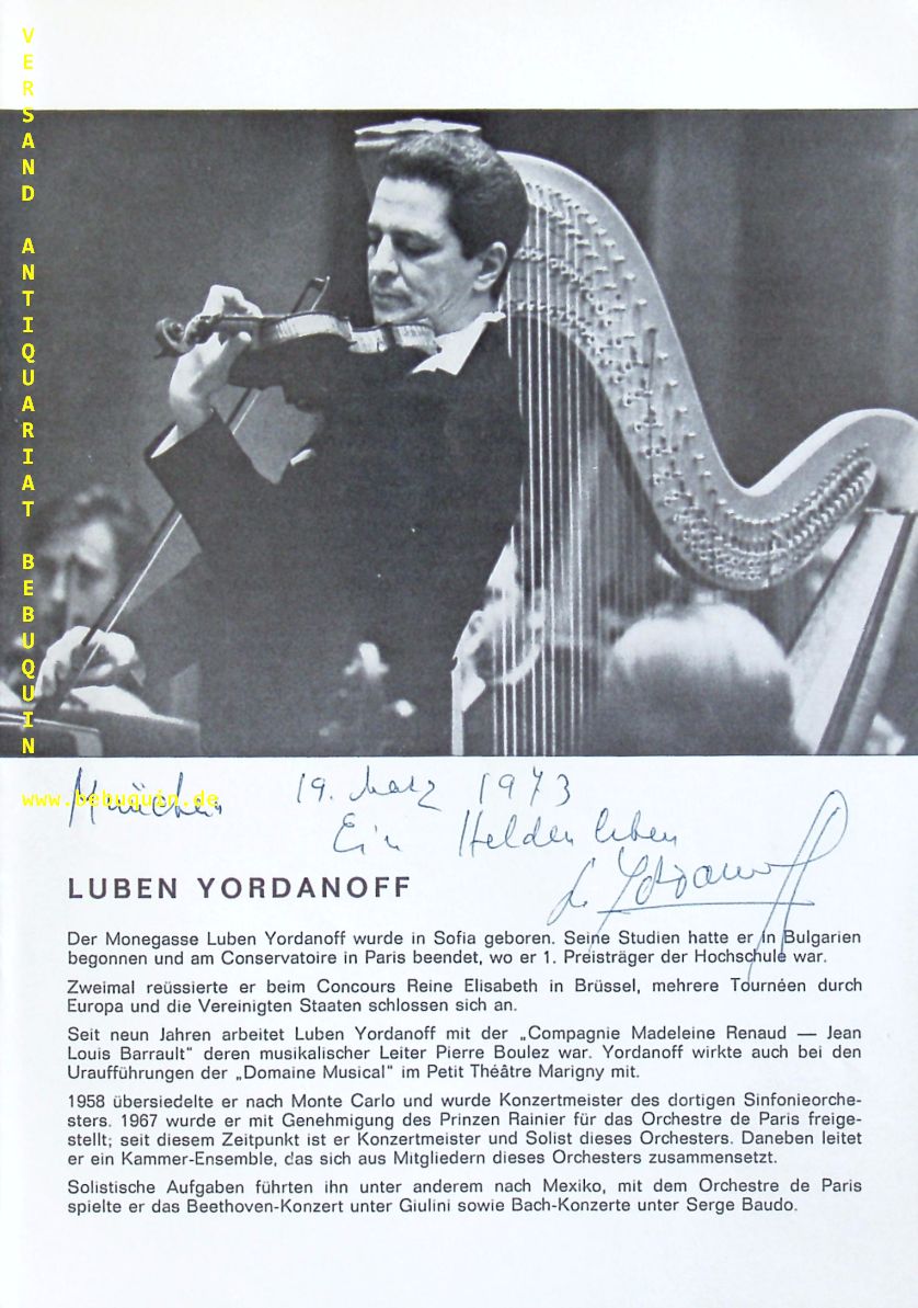 YORDANOFF, Luben (Violinist): eigenhändig signierte und datierte Portraitseite: Ein Heldenleben. München (Philharmonie), 19.3.1973. 21 x 15 cm. 1 Bl. Luben Yordanoff (né le 6 décembre 1926 à Sofia en Bulgarie et mort le 4 septembre 20111 à Chatou (en Yvelines, Île-de-France)), est un violoniste bulgare, puis monégasque. (Wikipedia)