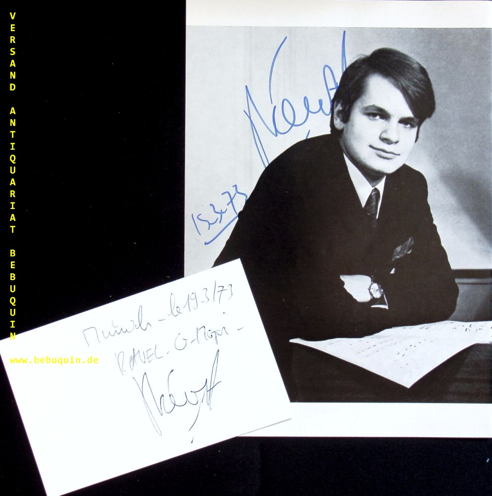 BEROFF, Michel (Pianist, Dirigent): eigenhändig signierte und datierte Portraitseite + eigenhändig signierte und datierte Autogrammkarte. München, 19,3,1973. 21 x 15 + 8 x 12,5 cm. 2 Blatt. Michel Béroff (* 9. Mai 1950 in Épinal) ist ein französischer klassischer Pianist und Dirigent. (Wikipedia)