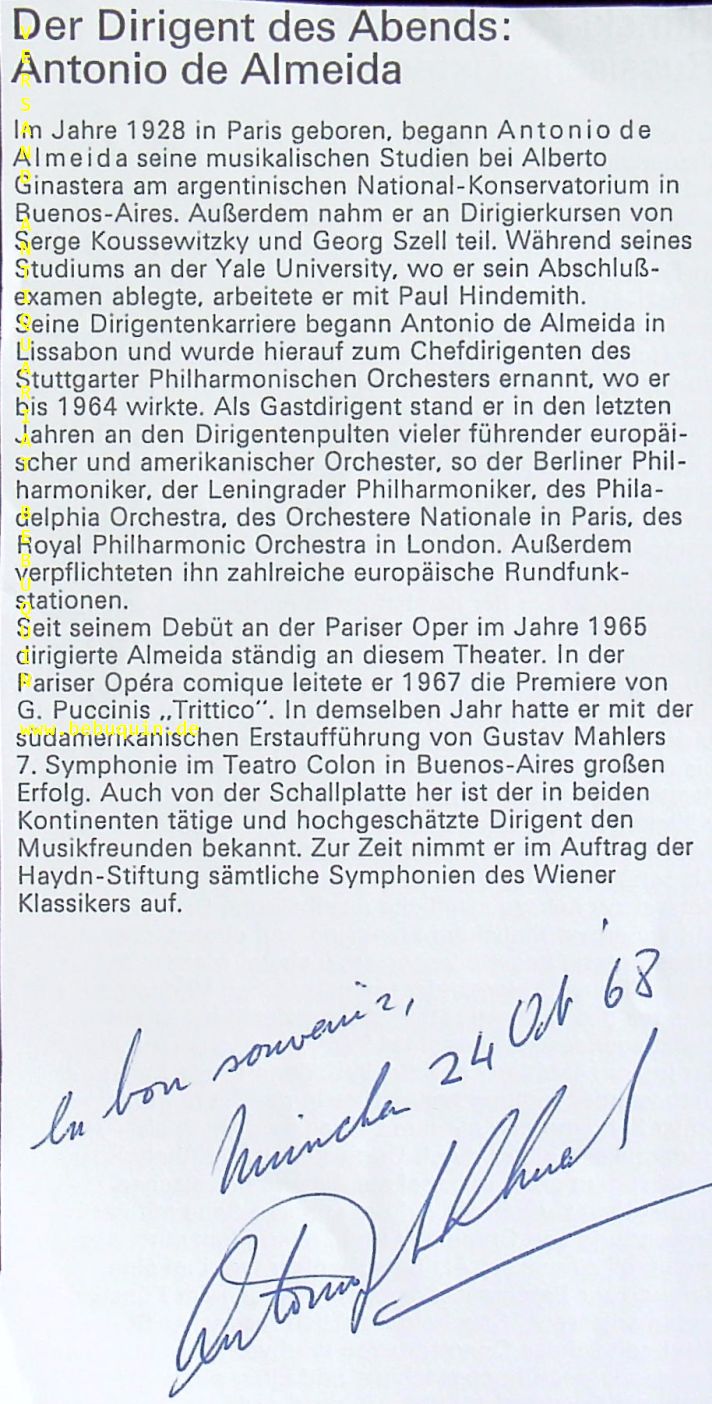 ALMEIDA, Antonio de (Dirigent): eigenhändig signierte ûndd atierte Programmseite: la bon souvernir. München, 24.10.1968. 17 x 9 cm. 1 Bl. . Antonio de Almeida (20 January 1928 – 18 February 1997) was a French conductor and musicologist of Portuguese-American descent. (Wikipedia)