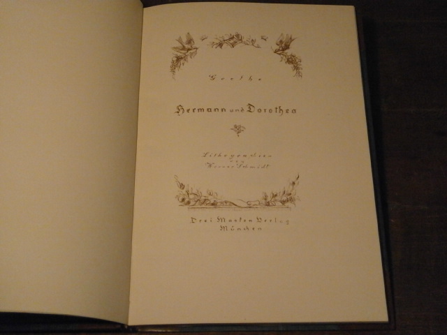 SCHMIDT.– GOETHE, Johann Wolfgang: Hermann und Dorothea. München (Drei Masken), 1923. 4°. 101 (2) S. mit Lithographien von Werner Schmidt. Handgebundener brauner Halbmaroquinband auf 5 Bünden mit reicher RVergoldung u. KGoldschnitt (sign.: Hübel & Denck. Leipzig). kleiner Wasserfleck auf vorderem Deckel, sonst absolut tadellos. Als X. Obeliskdruck in insgesamt 340 nummerierten Exemplaren in der Offizin C. Wolf & Sohn in München hergestellt. Hier eines von 250 Ex. der gewöhnlichen Ausgabe. – Der lithographierte Titel, zahlr. Lithographien im Text u. lithogr. Buchschmuck von Werner Schmidt in Braun. Druckvermerk vom Künstler in Bleistift signiert.