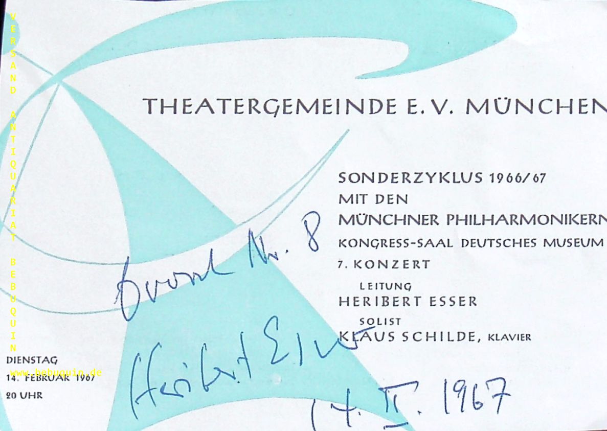 ESSER, Heribert (Dirigent): eigenhändig signierte Programmseite der Theatergemeinde München. München (Philharmonie), 14.2.1967. 9 x 13 cm. 1 Bl. Heribert Esser (* 12. Januar 1929 in Rheinhausen) ist ein deutscher Dirigent und Hochschullehrer. 1962 in Braunschweig zum Generalmusikdirektor ernannt, war er von 1987 bis 1994 Inhaber des Elder Chair of Music am Elder Conservatorium der University of Adelaide. Zuletzt leitete er das Philharmonische Staatsorchester Halle. (Wikipedia)