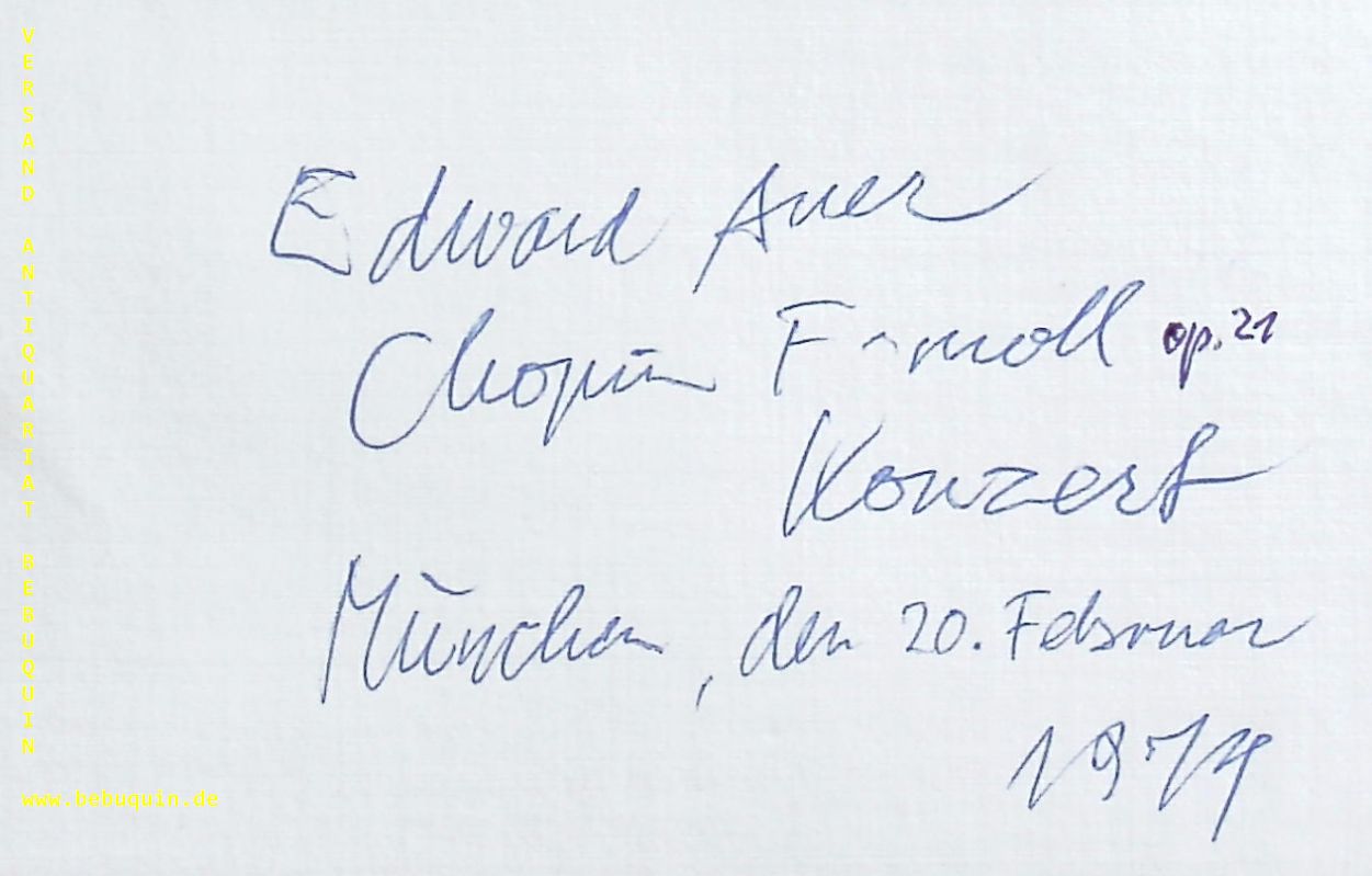 AUER, Edward (Pianist): eigenhändig signierte und datierte Autogrammkarte. München, 20.2.1974. 8 x 12,5 cm Karteikarte + Beiblatt. Edward Auer (born December 7, 1941 in New York City) is an American classical pianist. In 1965, he became the first American to prize in the International Chopin Piano Competition.