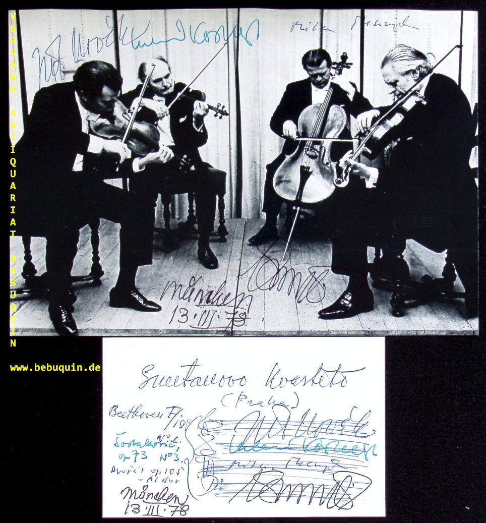 SMETANA-QUARTETT.– KOHOUT, Antonin + NOVAK, Jiri + KOSTECKY, Lubomir + SKAMPA, Milan: eigenhändig von allen signierte Portraitseite + eigenhändig von allen signierte und datierte Autogrammkarte. München, 13.3.1978. 14,5 x 21 cm. 3 Bl. Das Smetana-Quartett war ein tschechisches Streichquartett, das von 1945 bis 1989 bestand. Es entstand aus dem Streichquartett des Tschechischen Konservatoriums, das 1943, während der nationalsozialistischen Besatzungszeit, vom Cellisten Antonin Kouhout gegründet worden war. (Wikipedia)