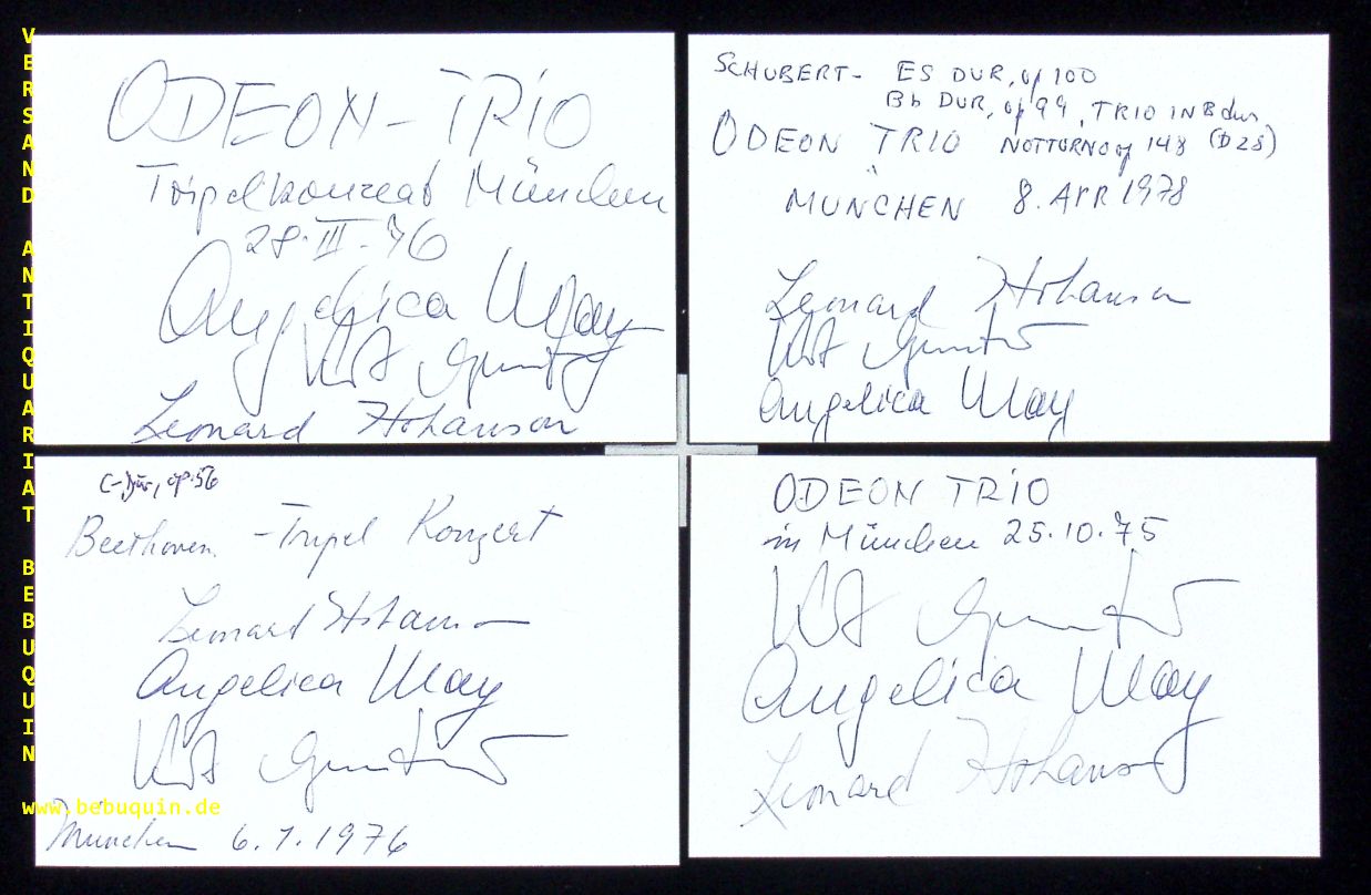 ODEON TRIO.– MAY, Angelica (Cellistin) + GUNTNER, Kurt (Violinist) + HOKANSON, Leonard (Pianist): 4 eigenhändig von allen signierte und datierte Autogrammkarten. München (Herkulessaal), 1975 -1978. 4 Kartenkarten. Autogramme von Angelica May (17.9.1933 – 7.1.2018) sind von großer Seltenheit. Angelica May war eine der renommiertesten deutschen Cellistinnen der Nachkriegszeit. Sie hatte das Glück, noch beim großen Pablo Casals studieren zu können. Angelica May gehörte zu den wenigen deutschen Cellistinnen, die sich nach dem Zweiten Weltkrieg einen internationalen Ruf erspielen konnten.
