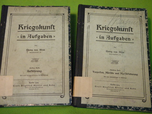 ALTEN, Georg von: Kriegskunst in Aufgaben. 1. Heft: Aufklärung. 2. Heft: Vorposten. Märsche und Marschsicherung. 2 Hefte in 1 Bd. Berlin (Mittler), 1902 / 1904. Gr. 8°. V, 130 S., 3 Bl., 146 S. + je 1 Kartenbeilage in Steindruck. HLn der Zeit unter Verwendung der Originaldeckel. Ordnungsgemäß aus Bundeswehrbeständen ausgesondertes Bibliotheksexemplar (Stempel, Rückenschild). EA.