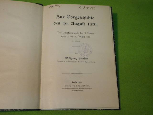 1870/71.– FOERSTER, Wolfgang: Zur Vorgeschichte des 16. August 1870. Das Oberkommando der II. Armee vom 12. bis 16. August 1870. Berlin (Eisenschmidt), 1905. Gr. 8°. 74 (6) S. + 1 Faltkarte im Anhang. HLdr der Zeit. Ordnungsgemäß aus Bundeswehrbeständen ausgesondertes Bibliotheksexemplar (Stempel, Rückenschild). EA.