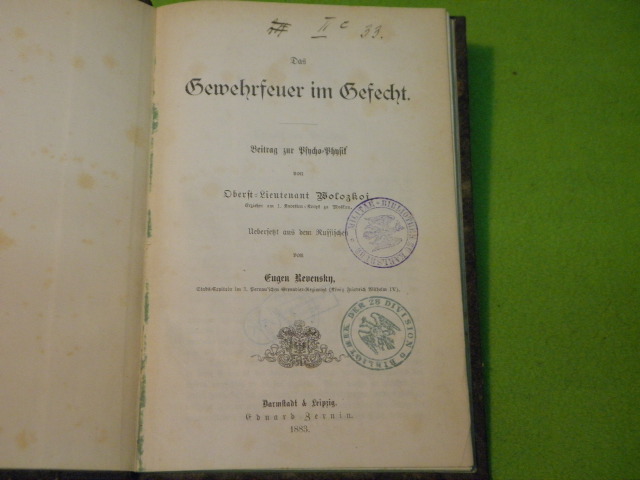 WOLOZKOI, Oberst-Lieutenant: Gewehrfeuer im Gefecht. Beitrag zur Psycho-Physik. D.v. Eugen Revensky. Darmstadt (Zernin), 1883. VII, 159 S. HLn der Zeit. Ordnungsgemäß aus Bundeswehrbeständen ausgesondertes Bibliotheksexemplar (Stempel, Rückenschild). dt. EA.