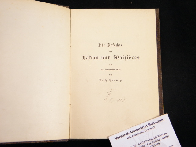 1870/71.– HOENIG, Fritz: Die Gefechte von Ladon und Maizieres am 24. November 1870. Nach amtlichen Quellen und handschriftlichen Aufzeichnungen von Mitkämpfern. Berlin (Felix), 1894. XII, 128 S. mit einem Faltplan im Anhang. Hldr der Zeit. Ordnungsgemäß aus Bundeswehrbeständen ausgesondertes Bibliotheksexemplar (Stempel, Rückenschild). = Gefechtsbilder aus dem Kriege 1870/71, Band III. seltene EA.