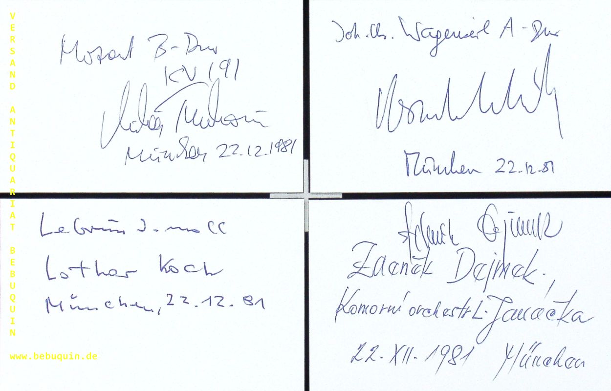 DEJMEK, Zdenek (Dirigent) + KOCH, Lothar (Oboist) + TURKOVIC, MIlan (Fagottist) + SCHIFF, Heinrich (Cellist): 4 eigenhändig signierte und datierte Autogrammkarten der Beteiligten. München, 22.12.1981. 8 x 12,5 cm. 4 Karteikarten + 4 Bl. Lothar Koch (* 1. Juli 1935 in Velbert; † 16. März 2003 in Salzburg) war ein deutscher Oboist. Heinrich Schiff (* 18. November 1951 in Gmunden; † 23. Dezember 2016 in Wien) war ein österreichischer Cellist und Dirigent. Milan Turkovic (* 14. September 1939 in Zagreb, Königreich Jugoslawien) ist ein österreichisch-kroatischer Fagottist und Dirigent. (Wikipedia)