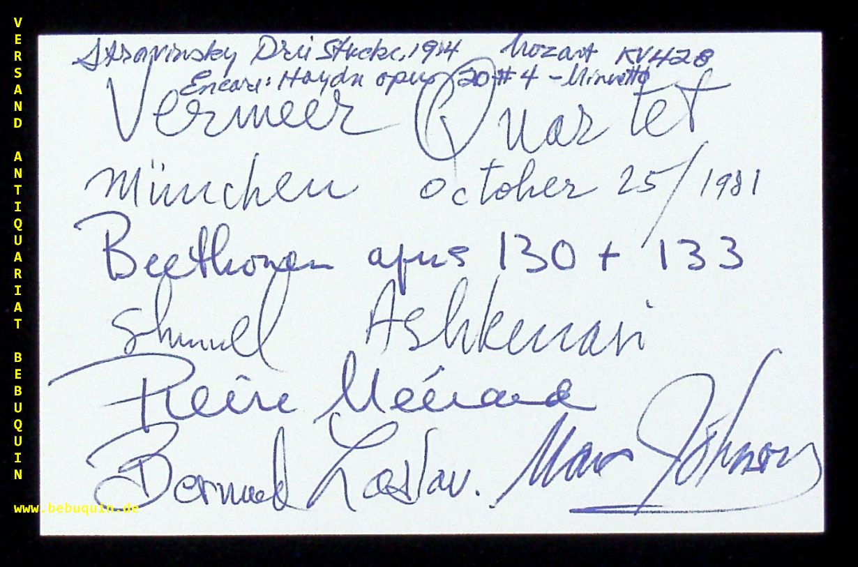 VERMEER-QUARTETT.– ASHKENASI, Shmuel + MENARD, Pierre + ZASLAV, Bernard + JOHNSON, Marc: eigenhändig von allen signierte und datierte Autogrammkarte. München, 25.10.1981. 8 x 12,5 cm. Karteikarte und diverse Beiblätter. The Vermeer Quartet was a string quartet founded in 1969 at the Marlboro Music Festival in Vermont and active until 2007. (Wikipedia)