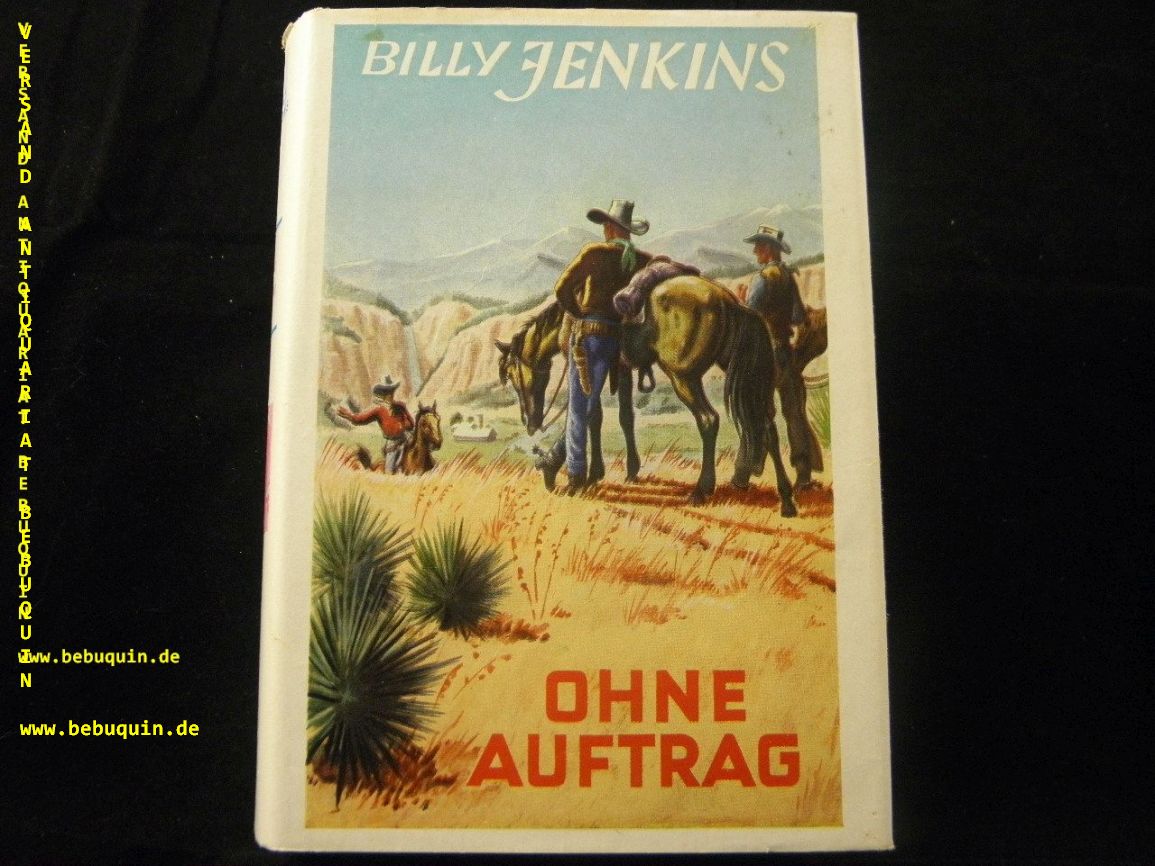 BILLY JENKINS.– BAUM, Peter: Ohne Auftrag. Sinzig (Uta), 1953. 256 S. farb. ill. OPb. mit OUmschl. Leihbuch ohne Stempel. = Billy Jenkins Wild – West – Erzählungen, Bd. 93. 1. Aufl. dieser Ausgabe.