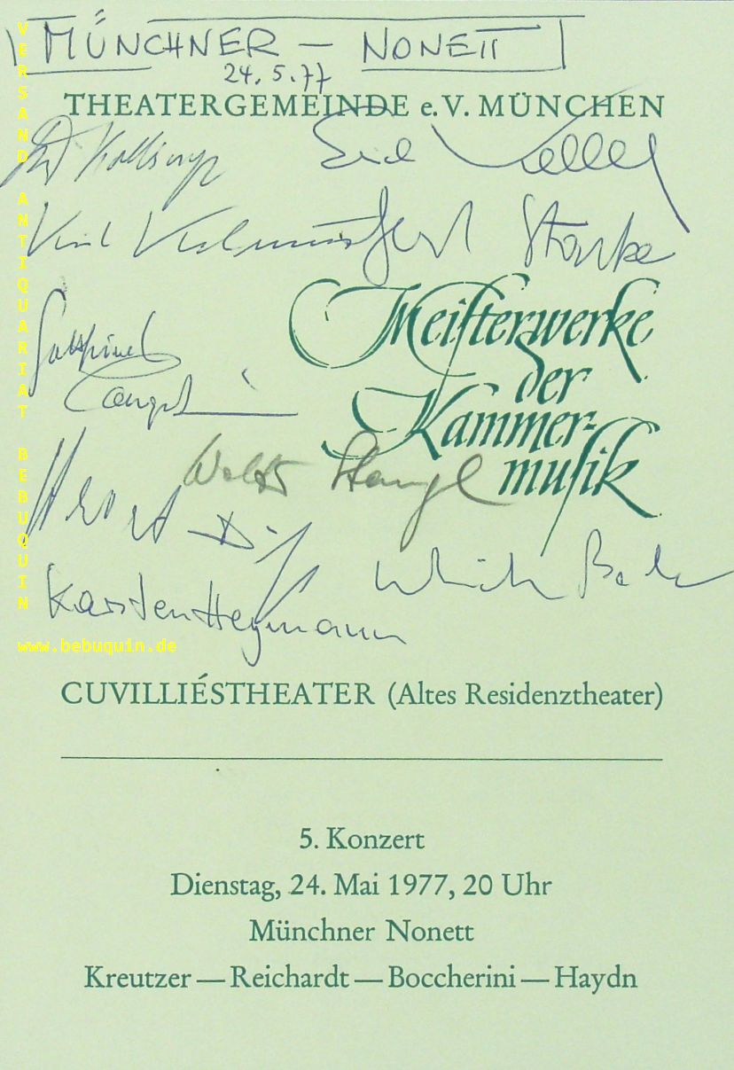 MÜNCHNER NONETT.– KELLER + HEYMANN + STANGL + BODE + DUFT + KALMUS + STARKE + KOLBINGER + LANGENSTEIN: eigenhändig von allen signiertes und datiertes Programmheft. München, 24.5.1977. 21 x 14,5 cm. 6 S.